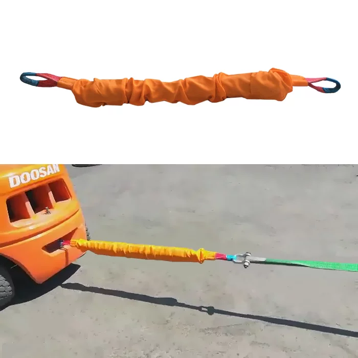 Тросогаситель компенсирует энергию рывка и предотвратит повреждение лобового стекла, бампера или другой части автомобилей от удара стальным тросом или концевым крепежным элементом в случае внезапного разрыва буксировочного стропа.