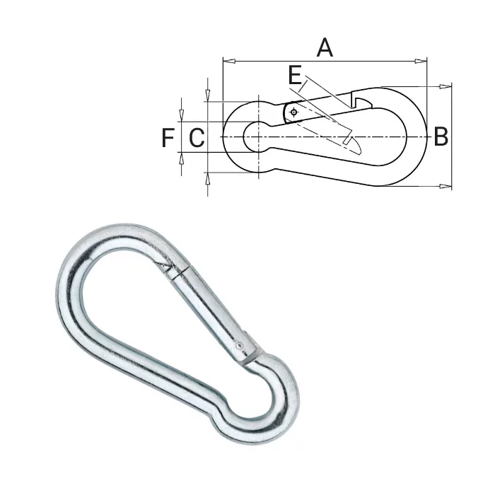 Найпоширеніший тип карабіна. Завдяки спеціальній пружній клямці виключається ризик випадкового роз'єднання закріплених елементів. Завдяки цій властивості, а також високій міцності самої конструкції, карабіни даного типу широко використовуються у військовій справі, екстремальному туризмі, рятувальних операціях, побутових та господарських потребах тощо. Номер карабіна – це діаметр прутка, з якого він виготовлений у міліметрах. Матеріал: вуглецева сталь. Оцинковане покриття. Спосіб виготовлення: штампування. Відповідає стандартам: DIN 5299 та ДСТУ 3979-2000.