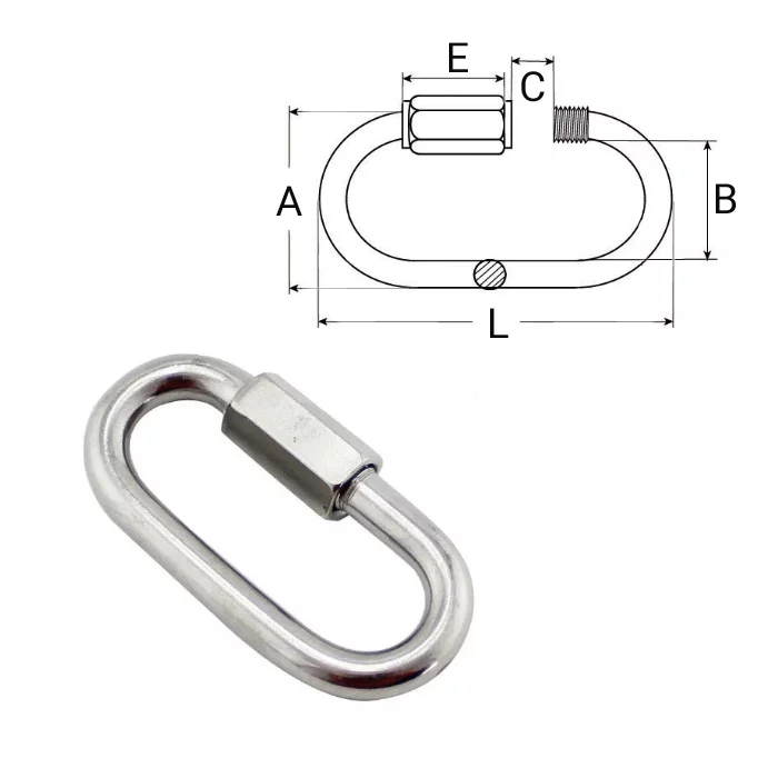 Овальний гвинтовий карабін - простий та надійний елемент для з'єднання такелажних компонентів, ланцюгів, сталевих тросів тощо. Круглий стрижень гвинтового карабіна виготовлений із міцної низьковуглецевої сталі з оцинкованим покриттям завтовшки 6 - 8 мкм. Особливістю цього типу карабіна є наявність гвинтового фіксатора. Номер карабіна – це діаметр прутка, з якого він виготовлений у міліметрах. Матеріал: вуглецева сталь. Оцинковане покриття. Спосіб виготовлення: штампування.