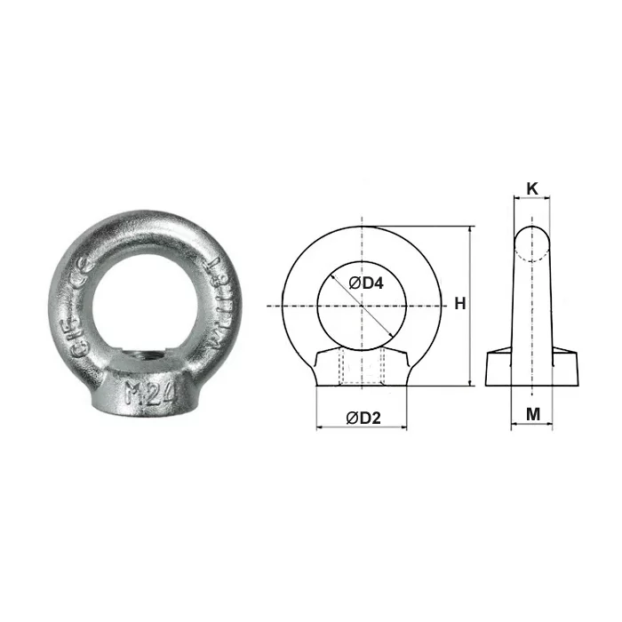Рым-гайка - это такелажный элемент, состоящий из монтажного кольца и круглой площадки с внутренней метрической правосторонней резьбой. Размер рым-гайки соответствует внутреннему диаметру резьбы. Изделие используется для проведения монтажных, строительных и такелажных работ, формирование растяжек и кратковременного подъема грузов. Материал: низкоуглеродистая сталь С15. Оцинкована. Коэффициент запаса прочности: 6:1. Соответствует стандарту: DIN 582.
