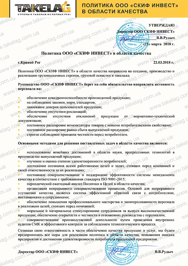 Політика ТОВ "СКІФ ІНВЕСТ" в галузі якості.