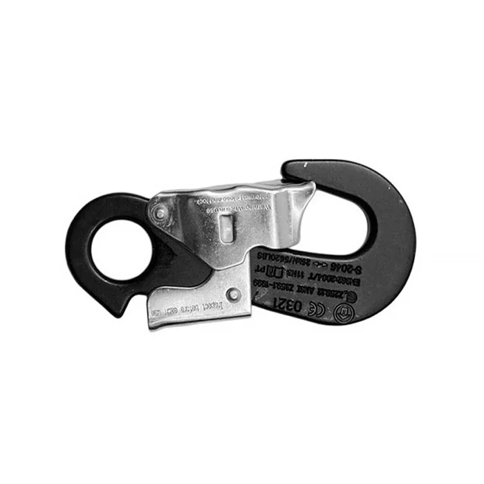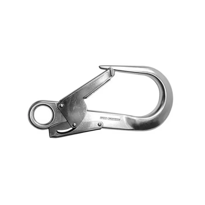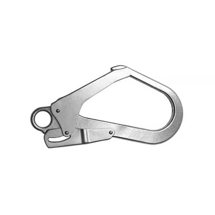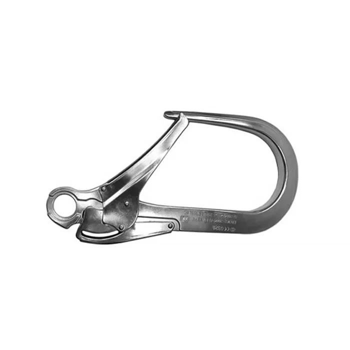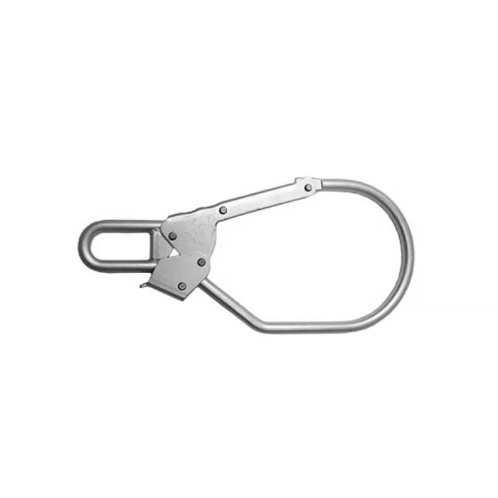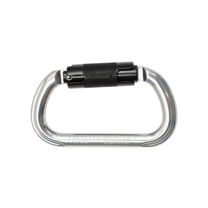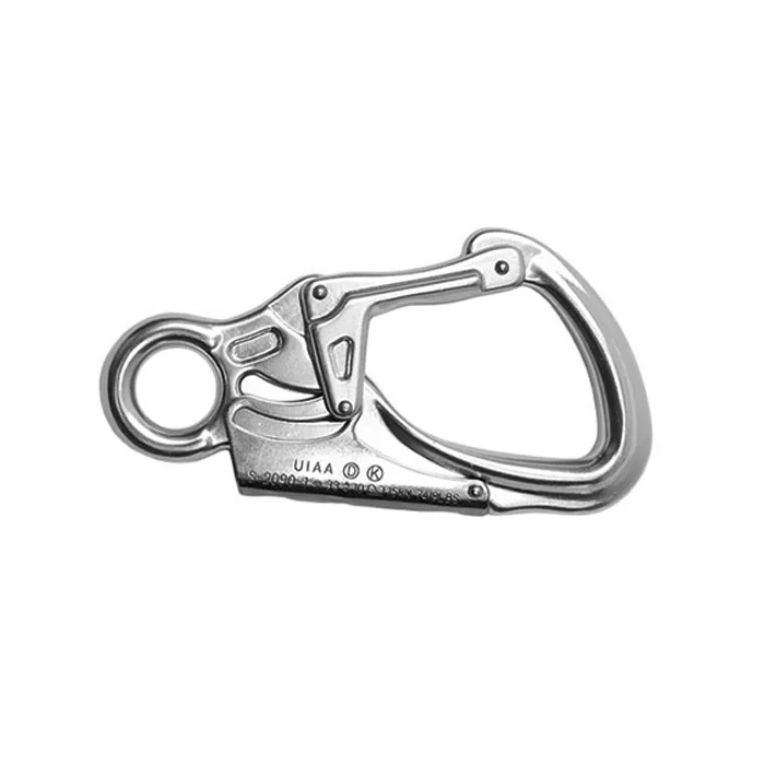 Монтажний карабін оснащується запобіжним механізмом, який виключає його випадкове відкриття, а також забезпечує швидке і надійне закріплення і відчеплення однією рукою. Засувка і фіксатор закриваються автоматично.