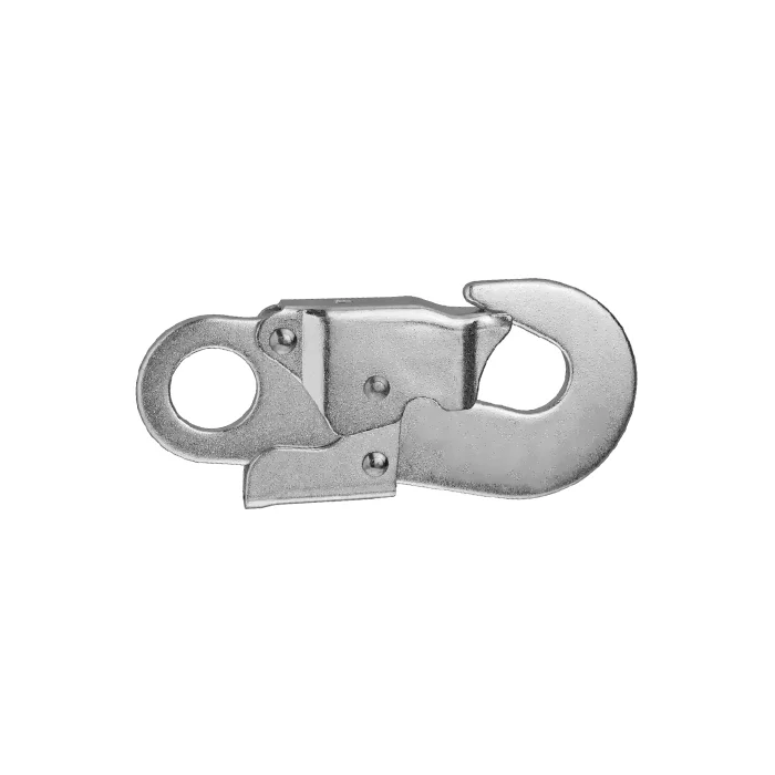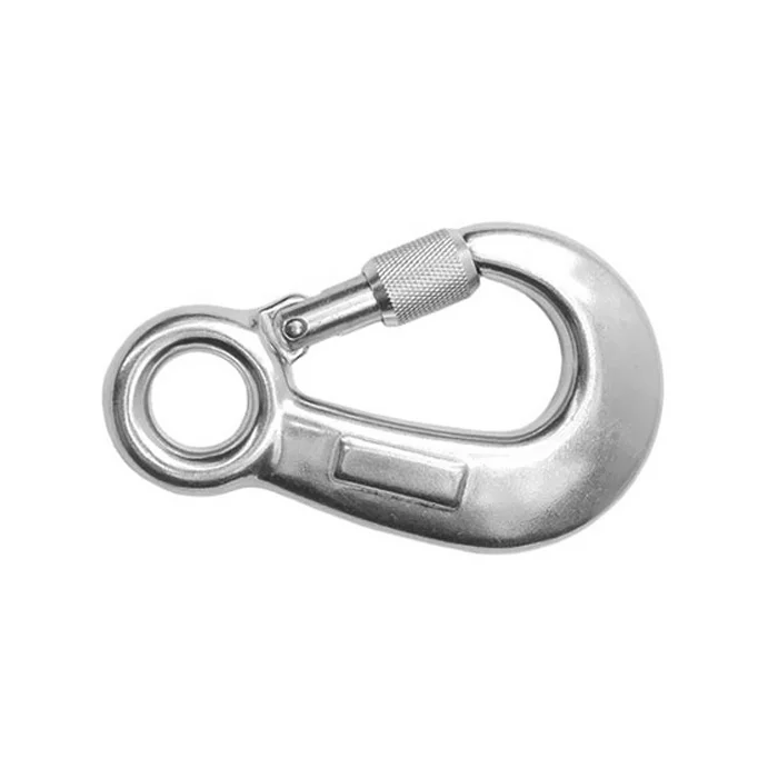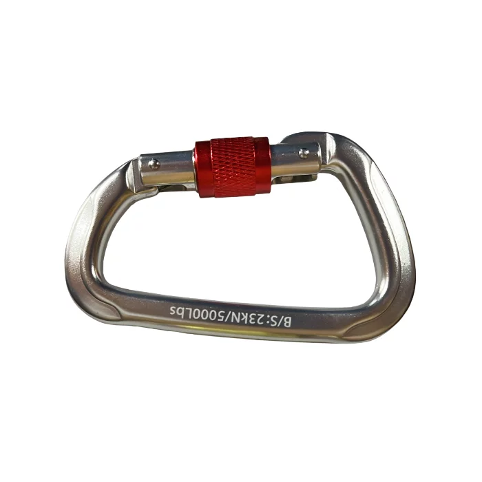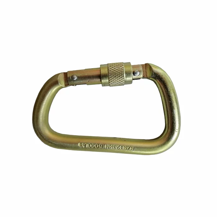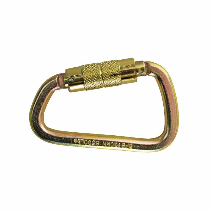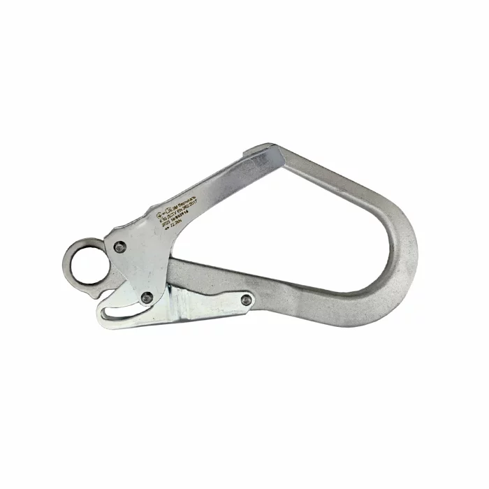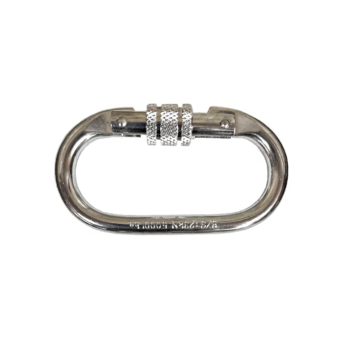 Монтажний карабін оснащується запобіжним механізмом, який виключає його випадкове відкриття, а також забезпечує швидке і надійне закріплення і відчеплення однією рукою. Засувка і фіксатор закриваються автоматично.