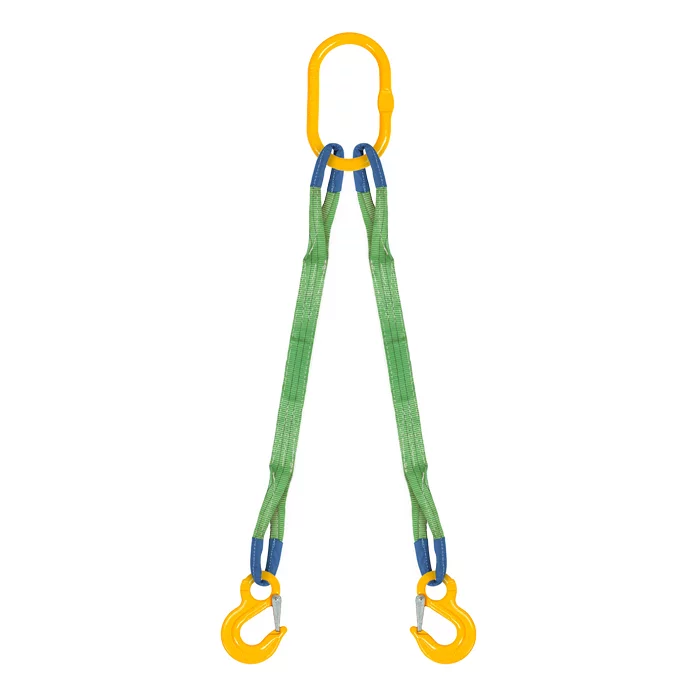 2СТ (строп текстильний двогілковий) складається с двох гілок об’єднаних овальною головною ланкою для навішування на крановий гак та кінцеві захоплюючі елементи з іншої сторони для стропування вантажу, що має дві точки кріплення.