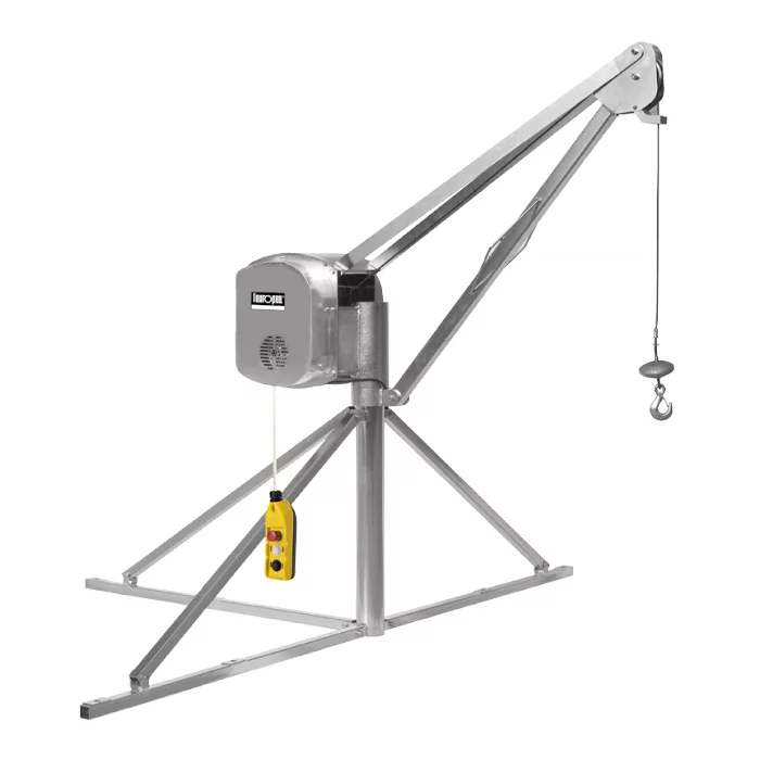 Електричні високошвидкісні міні-крани (лебідки будівельні електричні) ТМ EUROPEA застосовуються для вирішення широкого спектру завдань у малому будівництві та представлені лінійкою механізмів для підйому вантажів масою 300 - 700 кг. Електричні міні-крани від компанії Nidec ТЕА встановлені на тринозі і здатні обертатися навколо осі в діапазоні 200 - 360° (залежно від моделі). Перед експлуатацією пристрою, триніжна опора має бути надійно закріплена анкерами до рівної поверхні. Управління будівельною лебідкою здійснюється одним працівником за допомогою виносного пульта управління довжиною 1,5 м. Потужні та надійні електричні двигуни дозволяють піднімати та переміщувати вантажі з високою швидкістю на висоту до 60 метрів, що робить міні-крани EUROPEA унікальною пропозицією на українському ринку.