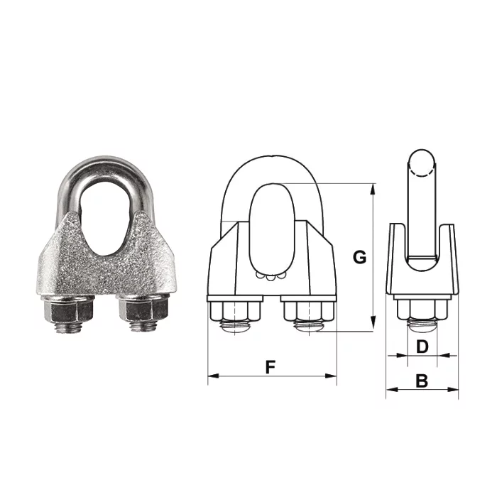 Усиленный и более надежный зажим для канатов предназначен для ответственных конструкций. В сравнении с монтажными зажимами имеет более широкую кованую колодку и утолщённую скобу. Материал: углеродистая сталь, покрытая цинком. Соответствует стандартам: DIN 1142, ДСТУ EN 13411-5.