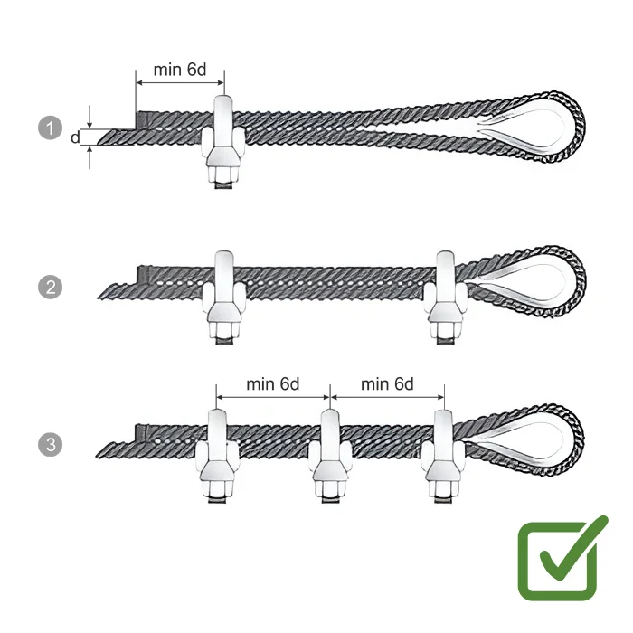 Важливо! Для надійного формування канатної петлі необхідно використовувати не менше 3-ох затискачів.