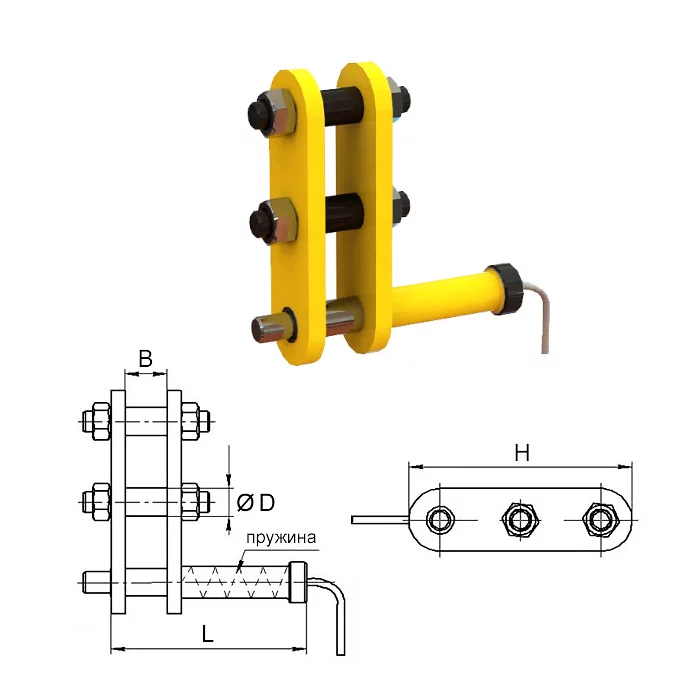 Конструктивно пристрій представляє дві бічні пластини з металу, об'єднаних за допомогою двох болтових з'єднань та рухомого штиря в обоймі, за допомогою якого відбувається дистанційне звільнення вантажу. Всередині обойми штиря встановлена пружина, що утримує пристрій у закритому положенні. Дистанційне розстропування вантажу відбувається при відтяжці штиря за допомогою тросової відтяжки.