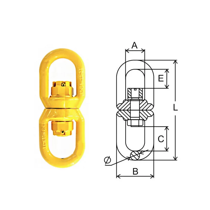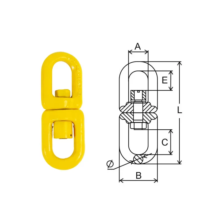 Бюджетний варіант ланки - вертлюга без підшипника. Підходить для роботи з вантажами відносно невеликих мас і потребує періодичного змащення. Ланки - вертлюги встановлюють у стропи як допоміжні такелажні елементи, завдання яких центрувати вантажі під час підйому, унеможливлюючи їхнє обертання на крановому гаку підйомного механізму. Вертлюги часто використовують у конструкціях строп для розмотування тросів і кабелів з підвішених на крані котушок. Коефіцієнт запасу міцності: 4:1. Матеріал: легована сталь. Стандарт: ДСТУ EN 1677-4.